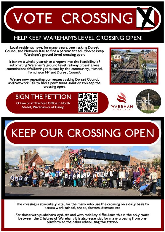 At a recent meeting of some 80 local residents in Wareham Town Hall, residents again called for action to keep Wareham’s Railway Crossing open. Network Rail’s strategic study in December 2021 proposed closure of the crossing but a commitment was made in 2022 by Dorset Council and Network Rail to seek a permanent solution to keeping the crossing open. Maintaining the surface level crossing is also included in Wareham’s Neighbourhood Plan. The Crossing is the only route for pedestrians and cyclists between the 2 halves of Wareham. It is vital for those who absolutely rely on it to access jobs, schools, shops, doctors, dentists etc every day as well as for those using the station.
